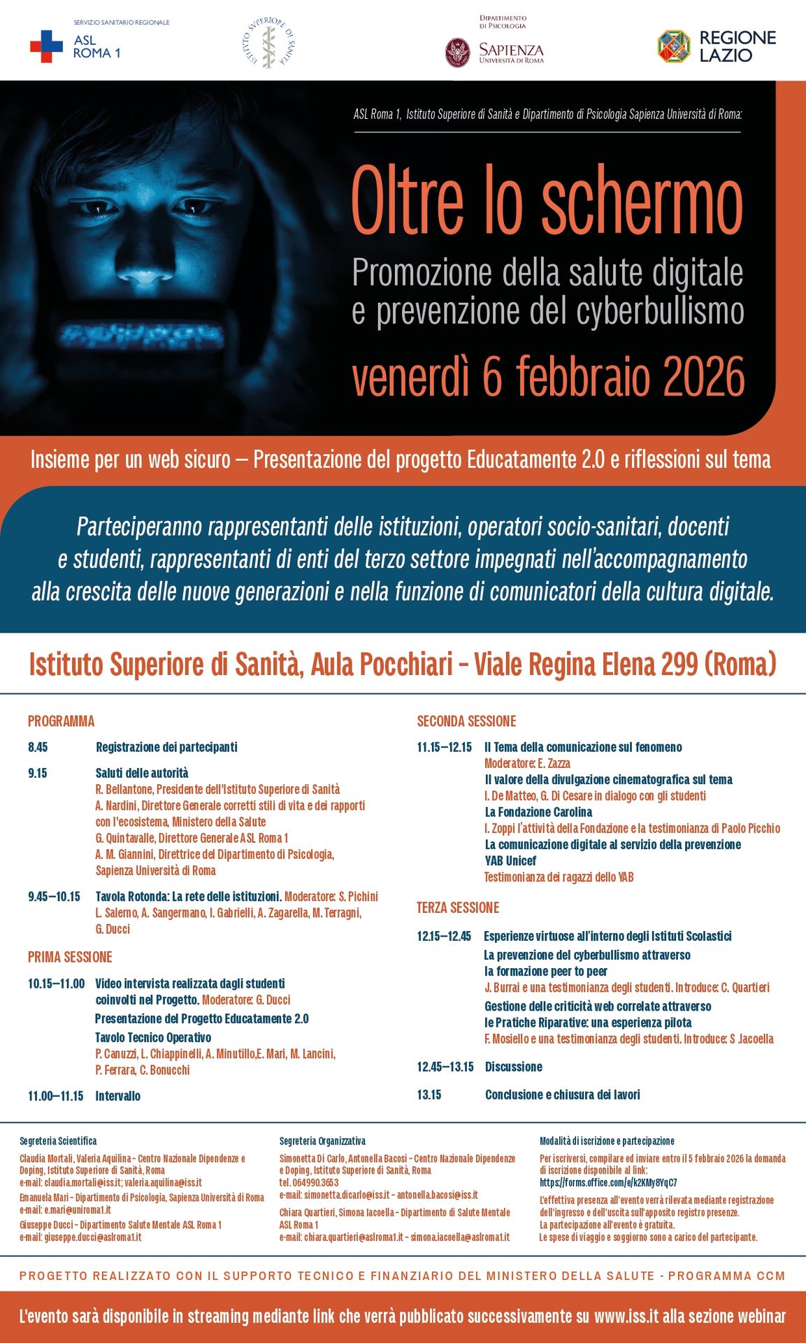 Venerdì 6 febbraio l’aula Pocchiari dell’Istituto Superiore di Sanità di Roma ospiterà il convegno “Oltre lo schermo: insieme per un web sicuro”: organizzato dall’Istituto Superiore di Sanità, in collaborazione con ASL Roma 1 e il Dipartimento di Psicologia della Sapienza Università di Roma, questo appuntamento rappresenta un’occasione importante per riflettere sulla promozione della salute digitale e sulla prevenzione del cyberbullismo in età evolutiva. L’iniziativa fa parte del progetto Educatamente 2.0 e vede il coinvolgimento attivo di rappresentanti delle istituzioni e di enti del terzo settore, esperti, docenti, studenti e operatori socio-sanitari.
